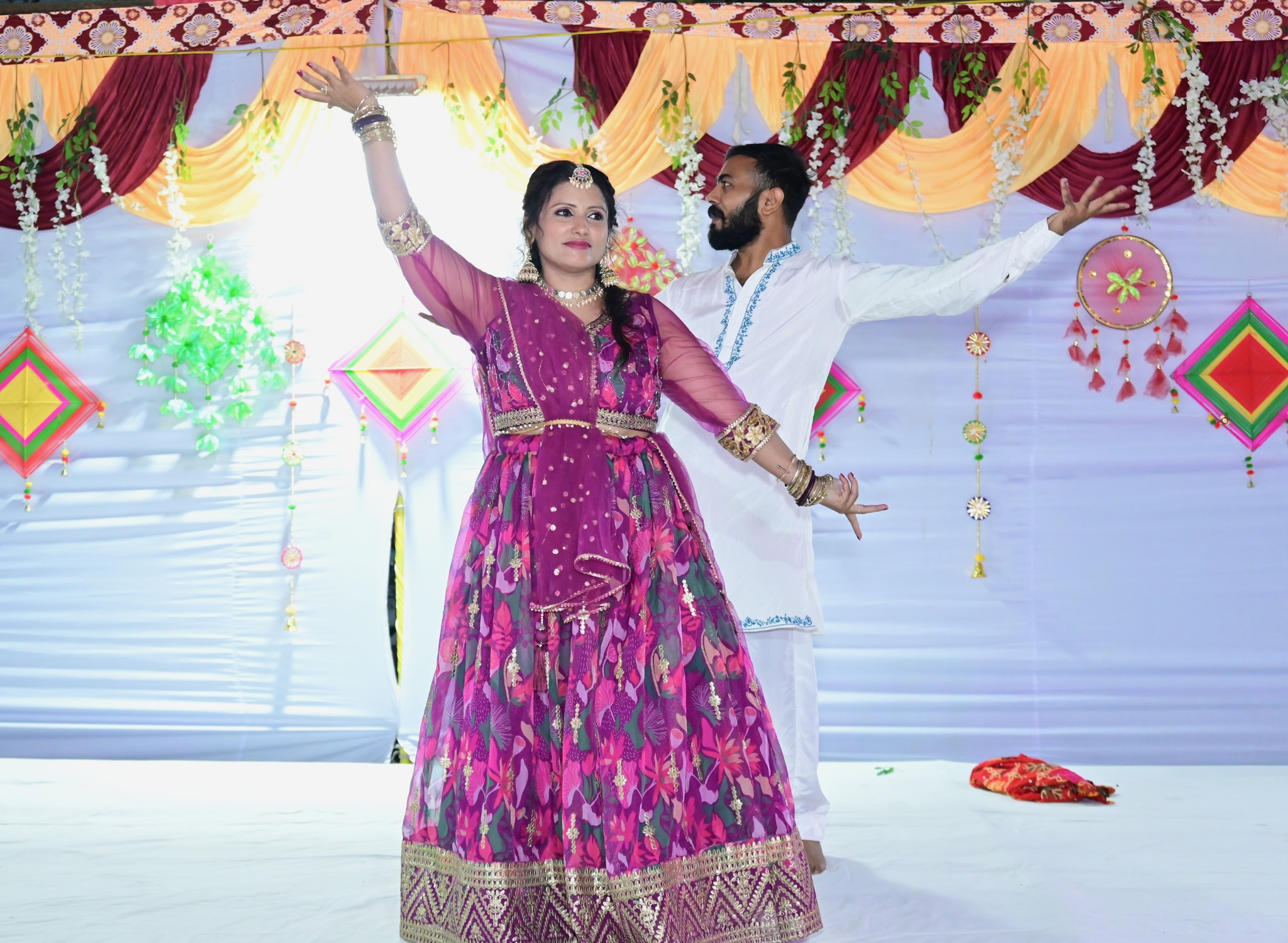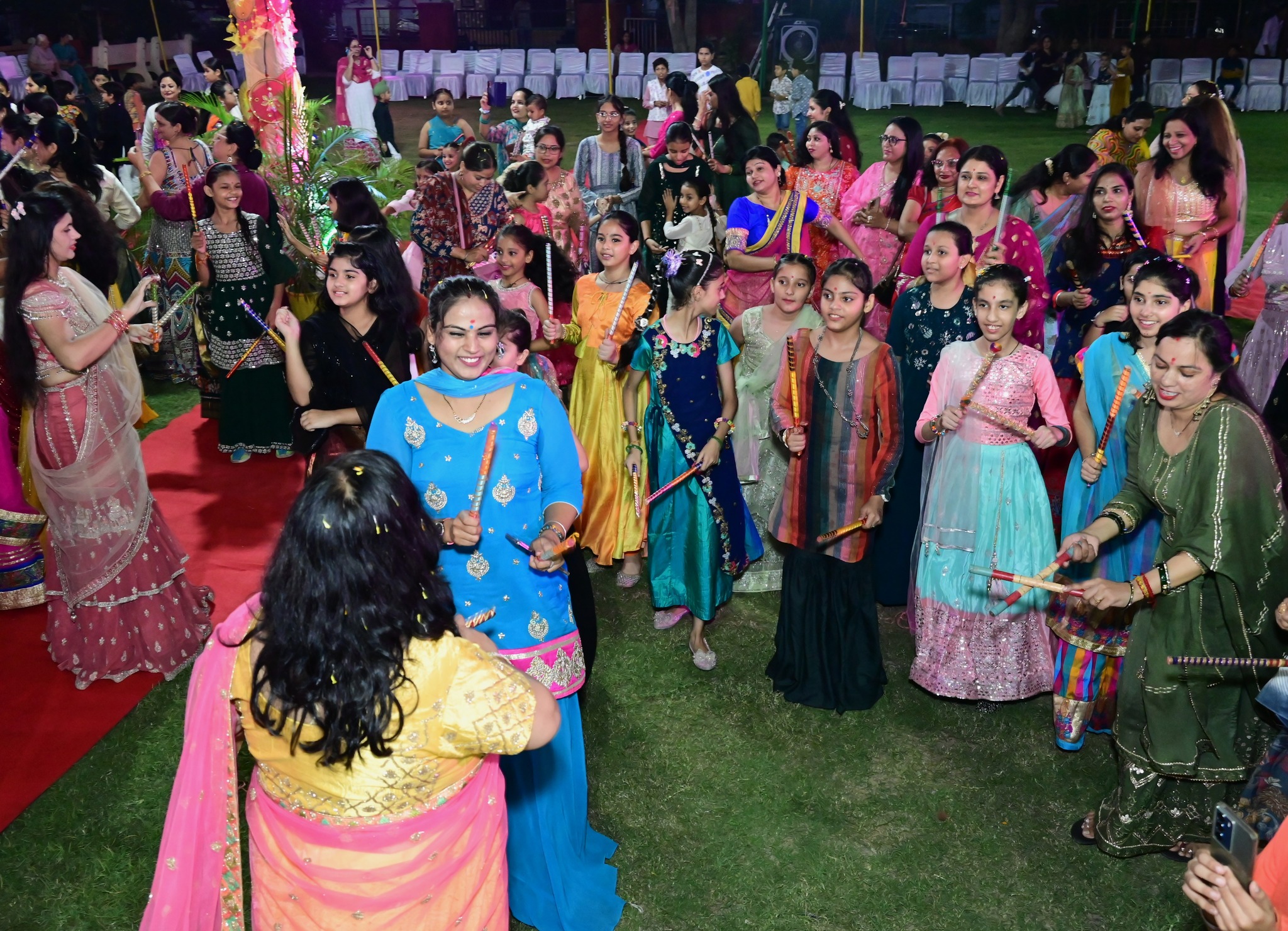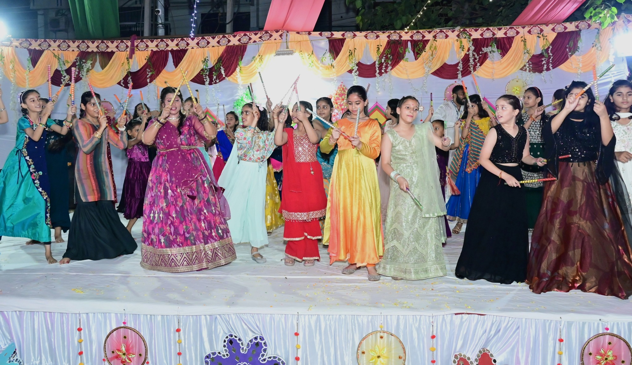 - The theme was "Celebrate festivals together" with vibrant attire including colorful lehengas, chunris, and dandiya sticks.